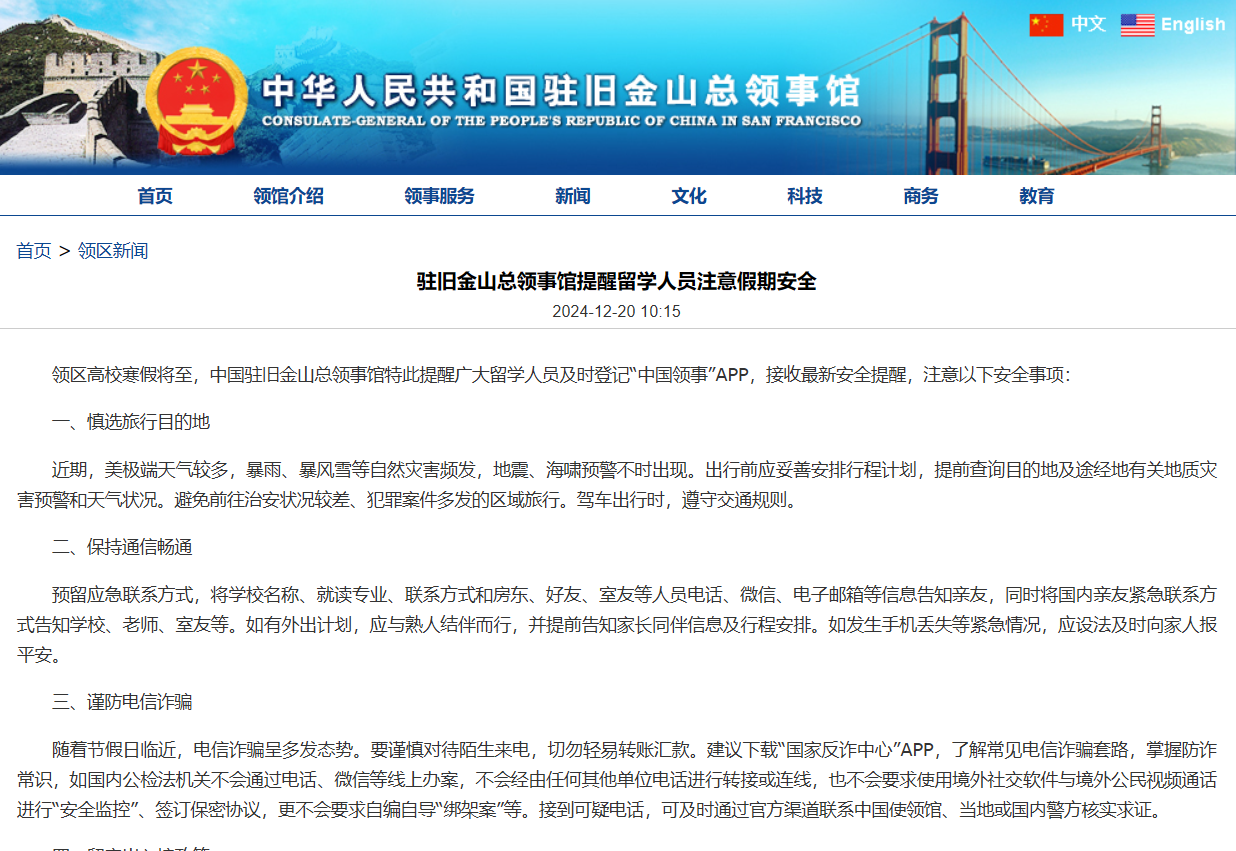 駐舊金山總領(lǐng)館:提醒留學(xué)人員注意假期安全
