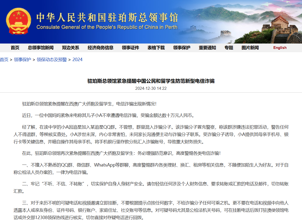 駐珀斯總領(lǐng)館:緊急提醒留學(xué)生防范新型電信詐騙