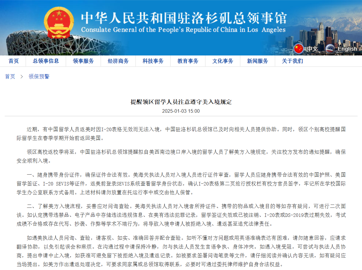 此外,近期有中國(guó)留學(xué)人員返美時(shí)因I-20表格無(wú)效無(wú)法入境,駐洛杉磯總領(lǐng)館已及時(shí)向相關(guān)人員提供協(xié)助。同時(shí)返校季將至,駐洛杉磯總領(lǐng)館提醒擬自美西南邊境口岸入境的留學(xué)人員確保攜帶合法有效的中國(guó)護(hù)照、美國(guó)留學(xué)簽證、I-20 SEVIS等證件,返美前登錄SEVIS系統(tǒng)查看留學(xué)身份狀態(tài),并確認(rèn)I-20表格旅行授權(quán)欄有校方官員簽字。了解美方入境流程,避免攜帶違禁品或存儲(chǔ)違法信息,以防被拒絕入境、遣返或追究法律責(zé)任。重要證件勿放托運(yùn)行李或交他人保管,并牢記學(xué)校國(guó)際學(xué)生辦公室聯(lián)系方式。遇美執(zhí)法人員問(wèn)詢時(shí),客觀如實(shí)回答并配合查驗(yàn),如語(yǔ)言困難請(qǐng)求翻譯,避免隨意回答。保持冷靜,避免爭(zhēng)執(zhí)。入境受阻可協(xié)商中止入境,避免遣返記錄。簽署文件前仔細(xì)閱讀,有疑問(wèn)當(dāng)場(chǎng)提出。如被遣返,可聯(lián)系家屬或總領(lǐng)館,必要時(shí)委托律師。