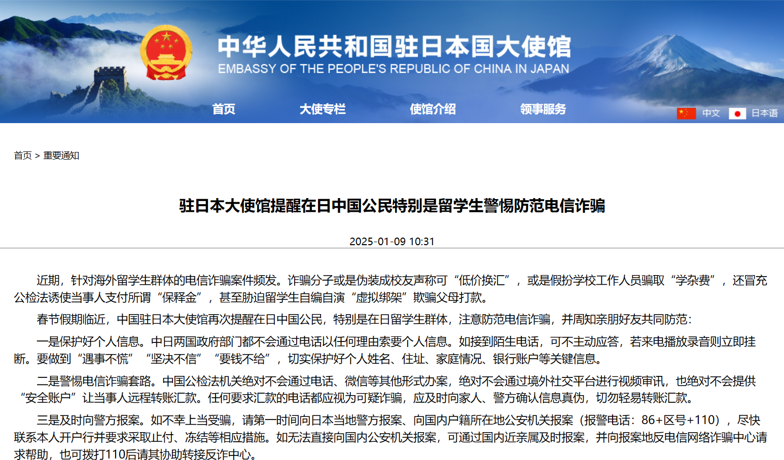 駐日本使館:提醒留學(xué)生與家長(zhǎng)警惕防范電信詐騙