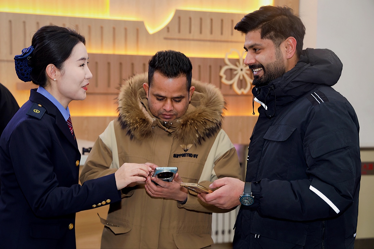 工作人員帶領(lǐng)來華留學(xué)生體驗(yàn)購(gòu)票、乘車等環(huán)節(jié),展示中國(guó)高鐵站如何提供高效智能的服務(wù),并向同學(xué)們講解了中國(guó)高鐵發(fā)展歷程和春運(yùn)背后承載的“團(tuán)圓”文化內(nèi)涵。