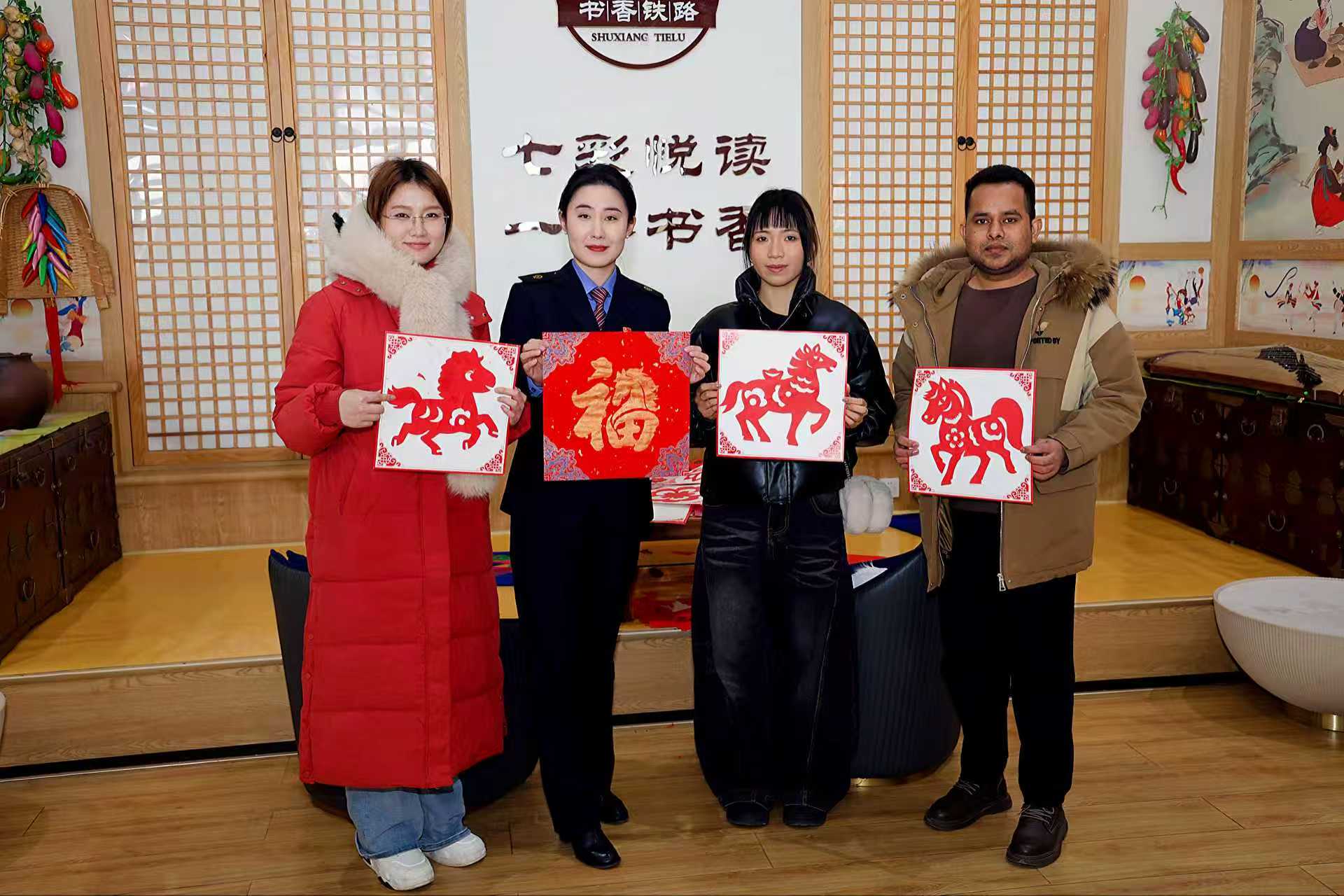 隨后,工作人員帶領(lǐng)同學(xué)們體驗(yàn)了站內(nèi)特色的“最美高鐵主題印章打卡”和非遺文化體驗(yàn)活動(dòng)。大家親手書寫“福”字,制作窗花剪紙,更真切地理解春節(jié)蘊(yùn)含的祈福寓意。