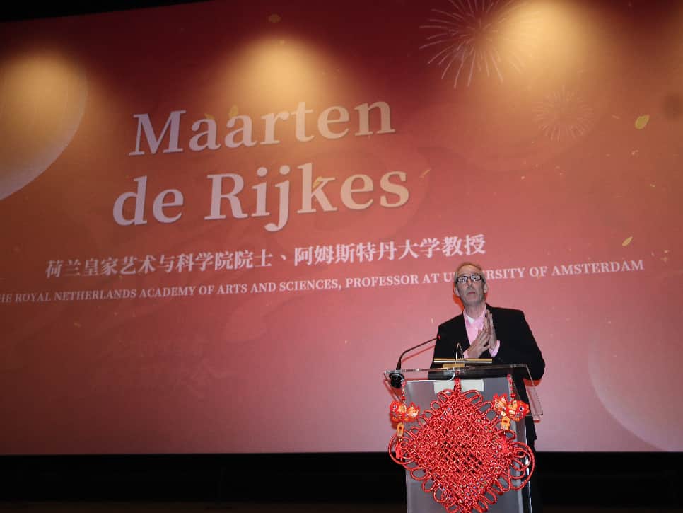 中國(guó)駐荷蘭大使申博,駐荷使館負(fù)責(zé)教育事務(wù)的參贊王文華,荷蘭皇家藝術(shù)與科學(xué)院院士、烏特勒支大學(xué)教授、蘭州大學(xué)特聘教授安德里斯·梅耶林克,荷蘭皇家藝術(shù)與科學(xué)院院士、阿姆斯特丹大學(xué)教授馬爾滕·德·賴克,荷蘭伊拉斯姆斯大學(xué)榮休教授、四川大學(xué)華西醫(yī)院特聘教授海因·拉特,以及來(lái)自教育、科研、媒體和企業(yè)界的嘉賓應(yīng)邀出席。荷蘭瓦赫寧根大學(xué)校長(zhǎng)卡羅琳·克魯澤,中國(guó)工程院外籍院士、荷蘭皇家藝術(shù)與科學(xué)院院士安東尼·比斯利,中國(guó)科學(xué)院院士、天津大學(xué)地球系統(tǒng)科學(xué)學(xué)院院長(zhǎng)劉叢強(qiáng)通過(guò)視頻送上新春祝福。
