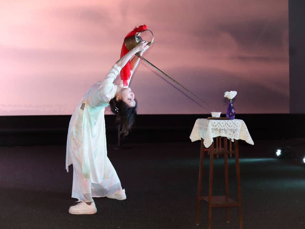 “承韻中華”篇章以中華優(yōu)秀傳統(tǒng)文化為精神內(nèi)核,將漢服、戲曲與非遺技藝引入當(dāng)代舞臺(tái),在歷史與現(xiàn)實(shí)的交匯處展開(kāi)一幅流動(dòng)的文化長(zhǎng)卷。舞臺(tái)之上,典雅的服飾意象徐徐鋪展,衣袂流轉(zhuǎn)間勾勒出東方審美的含蓄與從容;京劇經(jīng)典唱段唱腔婉轉(zhuǎn)、情感深沉,在一板一眼中講述忠孝情義與家國(guó)牽掛;長(zhǎng)嘴壺茶藝表演剛?cè)嵯酀?jì),行云流水的動(dòng)作既見(jiàn)匠心,也見(jiàn)力量。