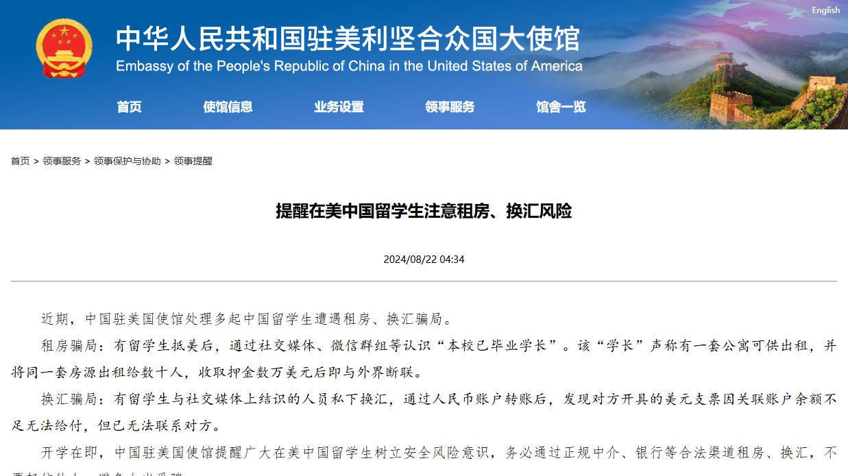 駐美使館提醒在美中國留學(xué)生注意租房、換匯風(fēng)險(xiǎn)