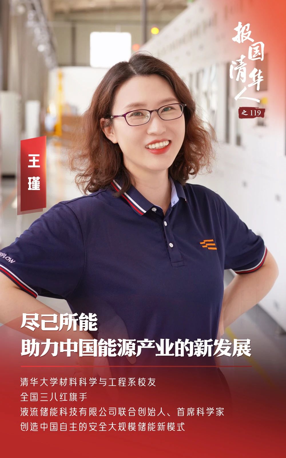 她是清華大學材料科學與工程系1999級本科、2003級碩士校友、全國三八紅旗手、全國巾幗建功標兵、液流儲能科技有限公司聯(lián)合創(chuàng)始人、首席科學家——王瑾。