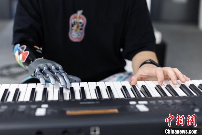 殘疾人使用智能仿生手彈琴。強(qiáng)腦科技供圖
