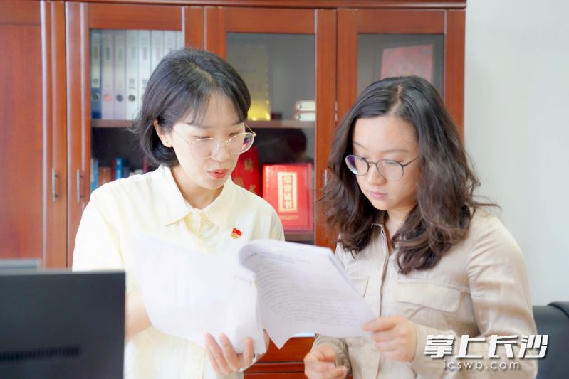 熊欣葉(左)和同事討論法律法規(guī)熱點(diǎn)。長(zhǎng)沙晚報(bào)全媒體記者 張禹 通訊員 段華良 攝影報(bào)道