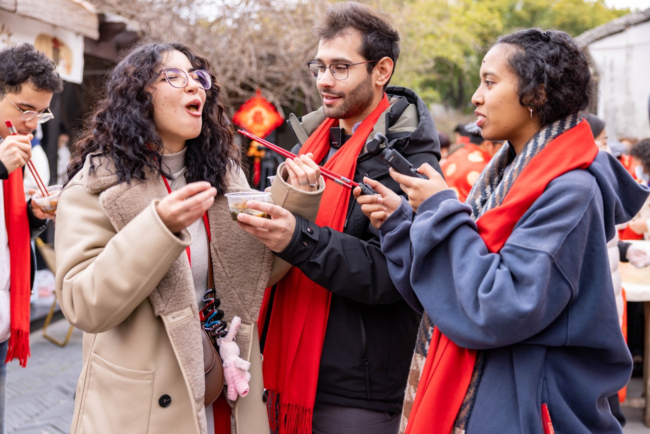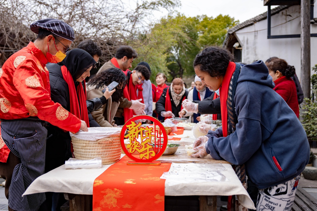 他們是寧波大學(xué)的15名留學(xué)生,來自蒙古、法國、摩洛哥等國家,當(dāng)天組成了一支“老街尋味團(tuán)”,在“老街”文化推介員的帶領(lǐng)下,走進(jìn)莊橋老街的“周三集市”與沐青軒青瓷文化園,通過自主探索,零距離體驗(yàn)趕集采購、感受非遺年俗、品嘗傳統(tǒng)年味,在鮮活的生活場景中觸摸中國地道的“老底子”年俗。