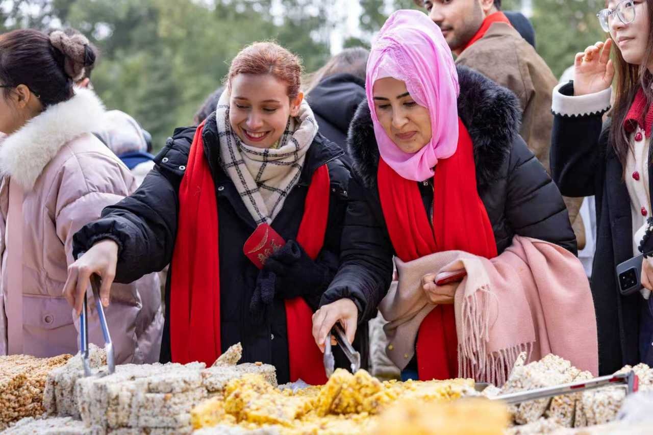 集市上匯聚了年節(jié)民俗用品、特色美食、新鮮蔬果、堅(jiān)果炒貨、日用百貨等400多個(gè)攤位,留學(xué)生們?nèi)谌肴肆鳎d致勃勃地詢價(jià)、挑選、品嘗。在一處售賣核桃、香榧等炒貨的攤位前,攻讀工商管理的蒙古留學(xué)生悠珍(中文名)指著開心果興奮地說:“我要買這個(gè)!小時(shí)候媽媽常從新疆帶開心果回來,那是我最喜歡的零食。”