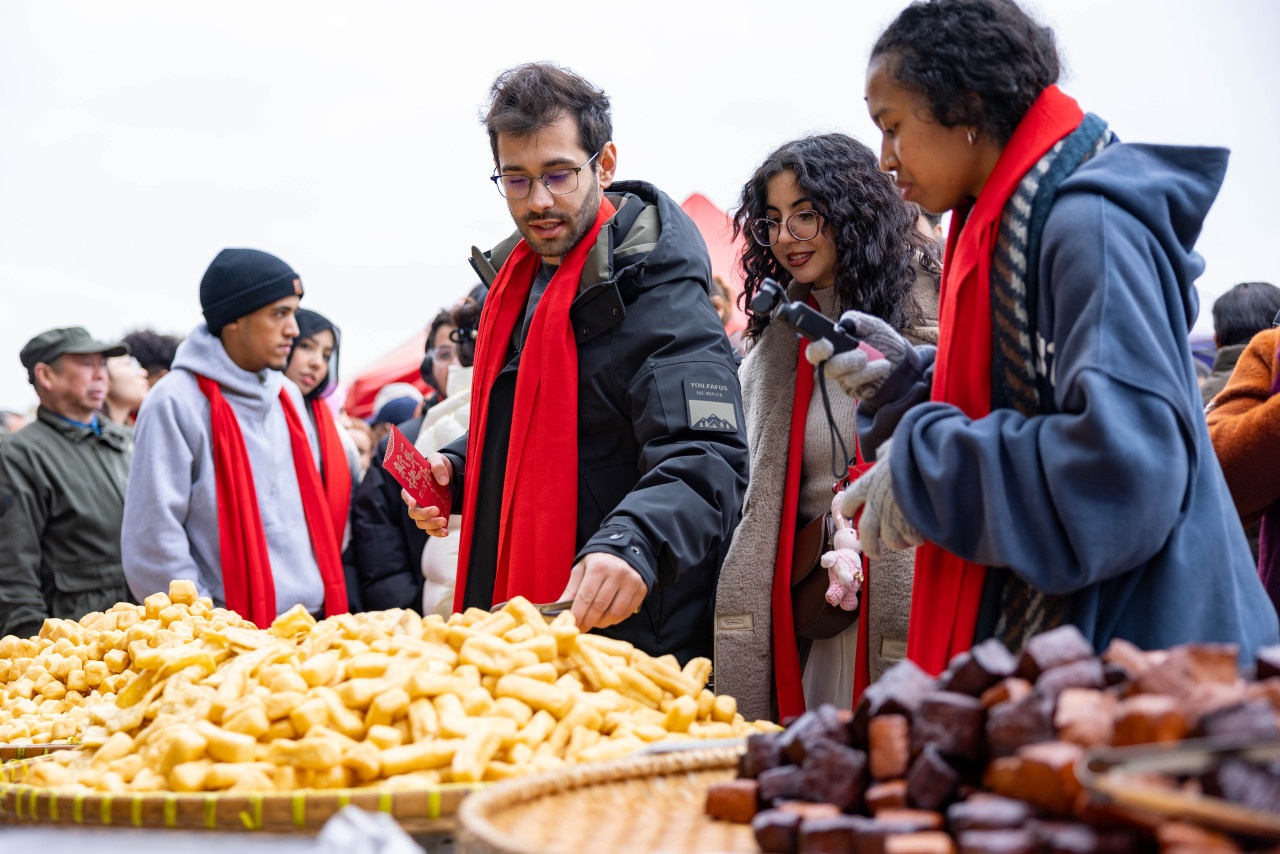 經(jīng)過布滿春聯(lián)、福字、燈籠、生肖貼畫等紅色年貨的攤位時(shí),留學(xué)生們紛紛駐足。在推介員的講解下,他們了解了春聯(lián)、紅包、拜年等春節(jié)習(xí)俗。一番采購后,有人買了瓜子、凍米糖,有人選了老蛋糕和中國結(jié),大家手提滿載的年貨,繼續(xù)漫步老街。